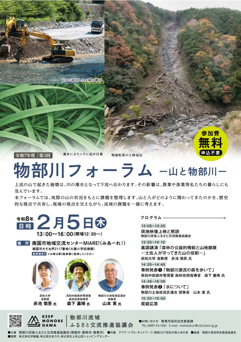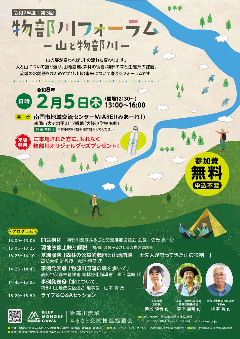 物部川の現状や抱える課題について知っていただき、その解決のために何ができるかを皆で考えるため、「山と物部川」をテーマとして、物部川流域ふるさと交流推進協議会(流域3市)の主催で「第3回物部川フォーラム」を開催します。